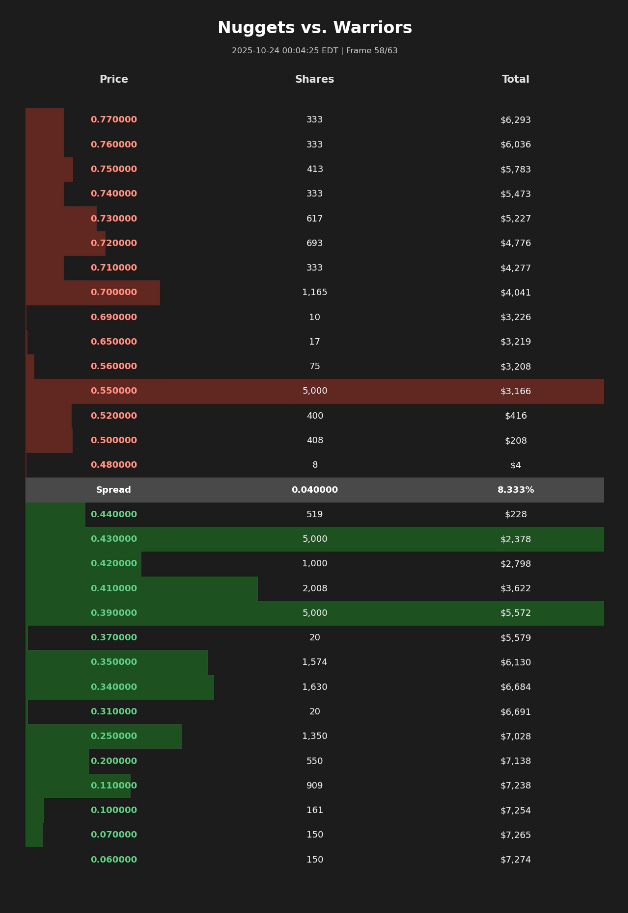 While the spread appears to be $0.04, it is effectively much wider given the shallow liquidity. $3,000 of liquidity is negligible for any serious orderbook. Compare this to any random regular season pregame NBA market, which maintain $0.01 spreads with substantially deeper liquidity on both sides: