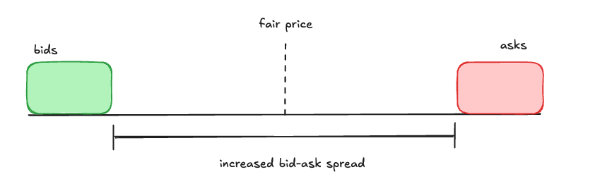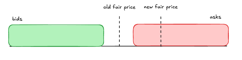 Recall that market makers make money by buying at a lower price and selling at a higher price. They make money when the fair price is between their bid and ask spread.